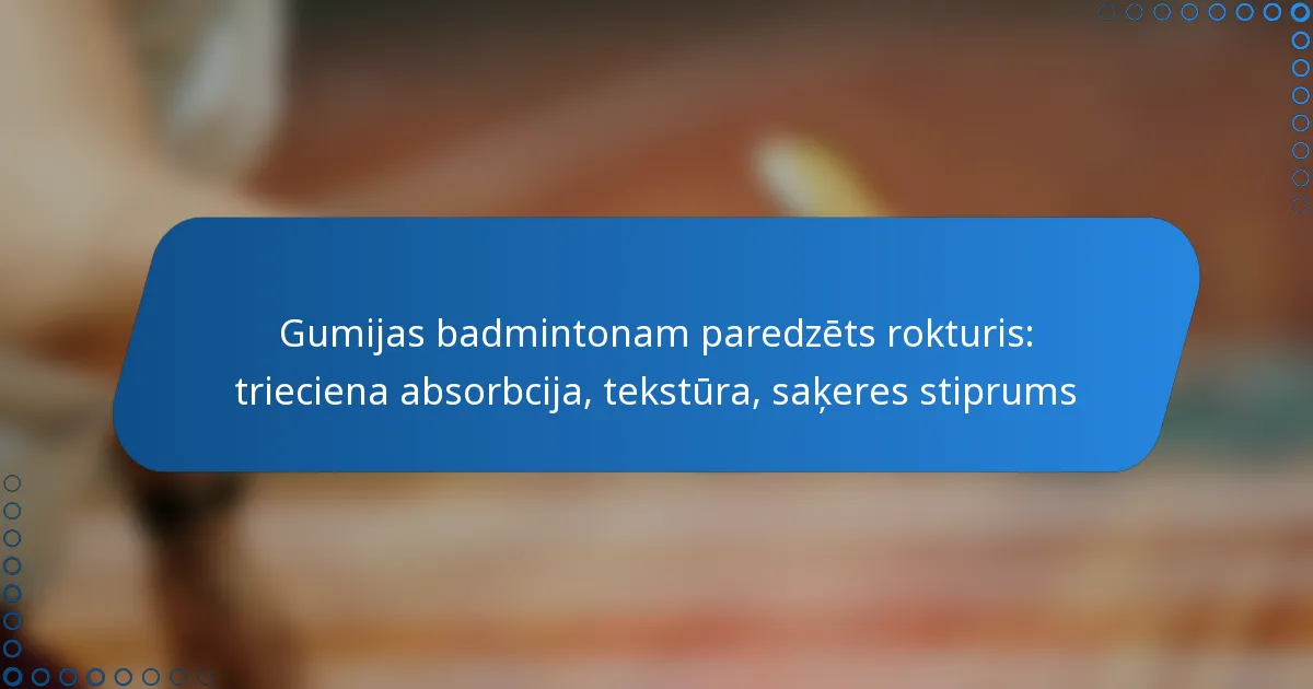 Gumijas badmintonu rokturi ir būtiski, lai uzlabotu spēlētāju sniegumu, pateicoties to triecienu absorbcijas spējām, kas samazina vibrācijas un minimizē traumu risku. Šo rokturu tekstūra spēlē svarīgu lomu roktura stiprumā un kontroles nodrošināšanā, ļaujot spēlētājiem efektīvi apstrādāt savus raketus. Izvēloties pareizo rokturi, spēlētāji var uzlabot komfortu un precizitāti spēles laikā.